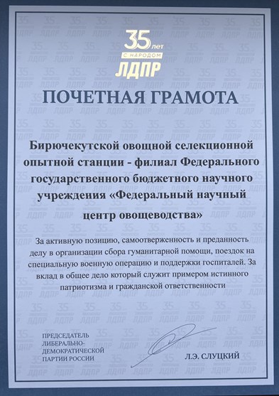 Награда за преданность общему делуКоординатор Октябрьского отделения Лилия Мирошник вручила Бирючекутской ОСОС – филиалу ФГБНУ ФНЦО почетную грамоту от председателя либерально-демократической партии России Леонида Слуцкого за активную позицию и преданность делу, которое служит примером истинного патриотизма и гражданской ответственности. Отдельно депутатом городской думы г. Новочеркасска Виктором Чеботаревым были награждены научные сотрудники станции за активную гражданскую позицию в организации сбора гуманитарной помощи и поддержке военных госпиталей.